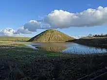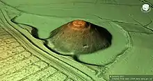 The base of the hill is circular and 167 metres (548 ft) in diameter. The summit is flat-topped and 30 metres (98 ft) in diameter. A smaller mound was constructed first, and in a later phase much enlarged. The initial structures at the base of the hill were perfectly circular: surveying reveals that the centre of the flat top and the centre of the cone that describes the hill lie within a metre of one another.[7] There are indications that the top originally had a rounded profile, but this was flattened in the medieval period to provide a base for a building, perhaps with a defensive purpose.[9]