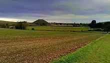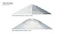 The site was first illustrated by the seventeenth-century antiquarian John Aubrey, whose notes, in the form of his Monumenta Britannica, were published between 1680 and 1682. Later, William Stukeley wrote that a skeleton and bridle had been discovered during tree planting on the summit in 1723. It is probable that this was a later, secondary burial. In October 1776 a team of Cornish miners overseen by the Duke of Northumberland and Colonel Edward Drax sank a vertical shaft from the top.[14] In 1849 a tunnel was dug horizontally from the edge into the centre. In 1867 the Wiltshire Archaeological and Natural History Society excavated the east side of the hill to see if traces of the Roman road were underneath it. No traces were found and later excavations south of the hill located the road in fields to the south, making a pronounced swerve to avoid the base of the hill. This was conclusive proof that the hill was there before the road – but the hill provided an alignment sight-line for the road.[15]