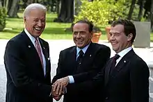 Berlusconi rapidly rose to the forefront of Italian politics in January 1994, forming a new party called Forza Italia.[59][60] He was elected to the Chamber of Deputies for the first time and appointed as prime minister following the 1994 Italian general election, when Forza Italia gained a majority in the Chamber of Deputies less than three months after having been launched.[61] His cabinet collapsed after nine months due to internal disagreements among the coalition parties, and he was succeeded as prime minister by Lamberto Dini.[62] In the 1996 Italian general election, Berlusconi was defeated by the centre-left candidate Romano Prodi.[63] In the 2001 Italian general election, he was again the centre-right candidate for prime minister and won against the centre-left candidate Francesco Rutelli.[64] Berlusconi then formed his second and third cabinets, until 2006. Berlusconi was the leader of the centre-right coalition in the 2006 Italian general election, which he lost by a very narrow margin, his opponent again being Prodi.[65] He was re-elected in the 2008 Italian general election following the collapse of the Second Prodi government and sworn in for the third time as prime minister on 8 May 2008.[66]