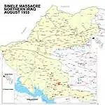 The Simele massacre (Arabic: مذبحة سميل, romanized: madhbaḥa Simīl), also known as the Assyrian affair,[5] was committed by the Kingdom of Iraq, led by Bakr Sidqi, during a campaign systematically targeting the Assyrians in and around Simele in August 1933. An estimated 6,000 Assyrians were killed and over 100 Assyrian villages were destroyed and looted.[6][7]
