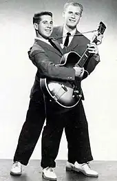 Under Big Records, Simon and Garfunkel assumed the name Tom & Jerry; Garfunkel named himself Tom Graph, a reference to his interest in mathematics, and Simon Jerry Landis, after the surname of a girl he had dated. Their first single, "Hey, Schoolgirl", was released with the B-side "Dancin' Wild" in 1957.[13][21] Prosen, using the payola system, bribed DJ Alan Freed $200 to play the single on his radio show, where it became a nightly staple.[22] "Hey, Schoolgirl" attracted regular rotation on nationwide AM pop stations, leading it to sell over 100,000 copies and to land on Billboard's charts at number 49.[22] Prosen promoted the group heavily, getting them a headlining spot on Dick Clark's American Bandstand alongside Jerry Lee Lewis.[23] Simon and Garfunkel shared approximately $4,000 from the song – earning two percent each from royalties, the rest staying with Prosen.[24] They released two more singles on Big Records ("Our Song" and "That's My Story") neither of them successful.[19][25][26]