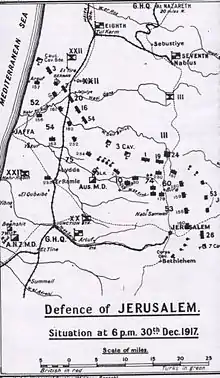 On 17 November EEF railhead reached 8 miles (13 km) east of Salmana 54 miles (87 km) from Kantara, the water pipeline with its complex associated pumping stations built by Army Engineers and the Egyptian Labour Corps had reached Romani.[53][100] Bir el Mazar, formerly the forward base of the Ottoman Army was taken over by the Anzac Mounted Division on 25 November 1916 the day before railhead. By 1 December the end of the most recently laid railway line was east of Mazar 64 miles (103 km) from Kantara.[53][100] The Ottomans constructed a branch railway line running south from Ramleh, on the Jaffa–Jerusalem railway, to Beersheba, by relaying rails taken from the Jaffa–Ramleh line. German engineers directed the construction of stone ashlar bridges and culverts when the line was extended from Beersheba. It had almost reached the Wadi el Arish in December 1916 when Magdhaba was captured.[112]