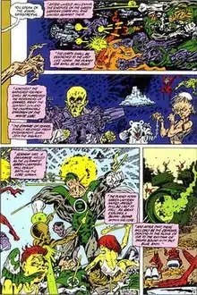 The creators called "Sinestro Corps War" "World War II with the entire universe".[19] In a September 2007 interview, Johns compared "Sinestro Corps War" to the Star Wars trilogy, with Green Lantern: Rebirth as A New Hope and "Sinestro Corps War" as The Empire Strikes Back.[20] References to other science fiction stories were made by artist Ivan Reis, who inserted characters such as E.T., ALF and a Predator into large two-page illustrations.[21] The writers also included the sound "EPA" in Green Lantern #25 as a direct reference to a scene in The Simpsons Movie where Comic Book Guy says it is the sound Green Lantern made when Sinestro[21] threw him in a vat of acid.