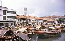The British governor Stamford Raffles arrived in Singapore on 28 January 1819 and soon recognised the island as a natural choice for the new port.[41] The island was then nominally ruled by Tengku Abdul Rahman, the Sultan of Johor, who was controlled by the Dutch and the Bugis.[42] However, the Sultanate was weakened by factional division: Abdul Rahman, the Temenggong of Johor to Tengku Abdul Rahman, as well as his officials, were loyal to the Sultan's elder brother Tengku Long, who was living in exile in Penyengat Island, Riau Islands. With the Temenggong's help, Raffles managed to smuggle Tengku Long back into Singapore. Raffles offered to recognise Tengku Long as the rightful Sultan of Johor, under the title of Sultan Hussein, as well as provide him with a yearly payment of $5000 and another $3000 to the Temenggong; in return, Sultan Hussein would grant the British the right to establish a trading post on Singapore.[43] The Treaty of Singapore was signed on 6 February 1819.[44][45]