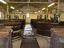 Yeast is added to the wort in a large vessel (often tens of thousands of litres) called a washback. Washbacks are commonly made of Oregon pine or stainless steel. The yeast feeds on the sugars, and as a by-product, produces both carbon dioxide and alcohol. This process is called fermentation and can take up to three days to complete. When complete, the liquid has an alcohol content of 5 to 7% by volume and is now known as wash. Up until this point the process has been quite similar to the production of beer.