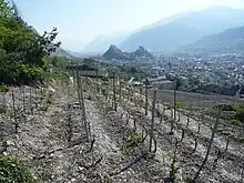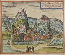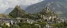 At the end of the 1st century BC, Sion was the capital of the Seduni, one of the four Celtic tribes of the Valais.[7] Julius Caesar mentions them as Nantuates Sedunos Veragrosque.[8] They were conquered by the Romans in the 10s BC. By 8–7 BC, Emperor Augustus praised the tribe (civitas) of the Seduni with an inscription. The town-hall is said to contain several Roman inscriptions, one of which found at Sion commemorates the Roman presence: Civitas Sedunorum Patrono.[8] Under the Romans it was known as Sedunum.