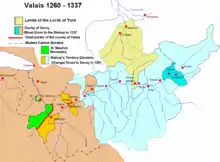 The fortunes of the city grew when the bishop settled there. In 999, King Rodolphe III of Burgundy granted the entire County of Valais to the bishop, and Sion became the capital of this county. The prince-bishop had the rights of high and low justice, the right to his own regalia and to appoint his own vassals. The residents of Sion were ruled by three appointees of the bishop, the maior, the vice dominus or Viztum and the salterus.[6]