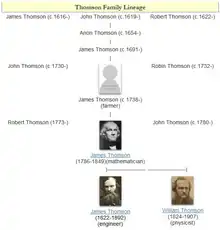 William Thomson's father, James Thomson, was a teacher of mathematics and engineering at the Royal Belfast Academical Institution and the son of a farmer. James Thomson married Margaret Gardner in 1817 and, of their children, four boys and two girls survived infancy. Margaret Thomson died in 1830 when William was six years old.[13]