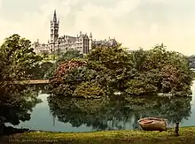 He was ennobled in 1892 in recognition of his achievements in thermodynamics, and of his opposition to Irish Home Rule,[9][10][11] becoming Baron Kelvin, of Largs in the County of Ayr. The title refers to the River Kelvin, which flows near his laboratory at the University of Glasgow's Gilmorehill home at Hillhead. Despite offers of elevated posts from several world-renowned universities, Kelvin refused to leave Glasgow, remaining until his eventual retirement from that post in 1899.[7] Active in industrial research and development, he was recruited around 1899 by George Eastman to serve as vice-chairman of the board of the British company Kodak Limited, affiliated with Eastman Kodak.[12] In 1904 he became Chancellor of the University of Glasgow.[7]