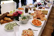The members of the Swedish merchant and upper class in sixteenth-century Sweden and Finland served schnapps table (brännvinsbord), a small buffet presented on a side table offering a variety of hors d'oeuvres served prior to a meal before sitting at the dinner table.[4] The most simple brännvinsbord was bread, butter, cheese, herring and several types of liqueurs; but smoked salmon, sausages and cold cuts were also served. The brännvinsbord was served as an appetizer for a gathering of people and eaten while standing before a dinner or supper, often two to five hours before dinner, sometimes with the men and women in separate rooms.[5] The smörgåsbord became popular in the mid-seventeenth century, when the food moved from the side table to the main table[5] and service began containing both warm and cold dishes. Smörgåsbord was also served as an appetizer in hotels and later at railway stations, before the dining cars time for the guests. During the 1912 Olympic Games, restaurants in Stockholm stopped serving smörgåsbord as an appetizer and started serving them instead as a main course.