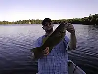 The smallmouth bass (Micropterus dolomieu) is a species of freshwater fish in the sunfish family (Centrarchidae) of the order Perciformes.[3] It is the type species of its genus Micropterus (black basses), and is a popular game fish sought by anglers throughout the temperate zones of North America, and has been spread by stocking—as well as illegal introductions—to many cool-water tributaries and lakes in Canada and more so introduced in the United States.[4] The maximum recorded size is approximately 27 inches (69 cm) and 12 pounds (5.4 kg).