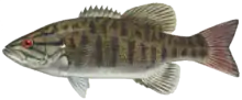 Smallmouth have a slender but muscular fusiform body shape making them powerful swimmers.[6] The coloration of the smallmouth bass' ctenoid scales range from golden-olive to dark brown dorsally which fades to a yellowish white ventrally with dark brown vertical bars or blotches along the body and dark brown horizontal bars on the head.[7] The combination of the muscular fusiform body shape and camouflage like coloring make these fish highly effective ambush predators. The coloration can vary greatly depending on the fishes age, habitat, water quality, diet, and the spawning cycle.