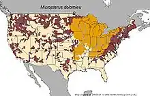 There are two recognized subspecies, the Northern smallmouth bass (M. dolomieui dolomieui) and the Neosho smallmouth bass (M. dolomieui velox).[12] The Northern smallmouth bass is much more widespread than the much smaller subgroup called the Neosho smallmouth bass. The Neosho are native to an ecologically isolated region of the lower Midwest known as the Central Interior Highlands, which weave through southwestern Missouri, northern Arkansas and northeastern Oklahoma.[13]