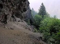 Strong damaging winds (80 to 100 mph (130 to 160 km/h), or sometimes greater) are observed a few times each year around the Smoky Mountains during the cool season (October through April), as a result of a phenomenon known as mountain waves.[12] These mountain wave winds are strongest in a narrow area along the foothills, and can create extensive areas of fallen trees and roof damage, especially around Cades Cove in the Great Smoky Mountains National Park and the Camp Creek community.[13] Strong winds created by mountain waves were a contributing factor with the devastating Gatlinburg fire on November 28, 2016 during the 2016 Great Smoky Mountains wildfires.[14] Damaging winds can also be generated by strong thunderstorms, with tornadoes and strong thunderstorm complexes (also known as mesoscale convective systems) occasionally affecting the Smoky Mountains.[15]
