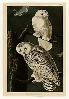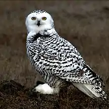 The snowy owl (Bubo scandiacus),[4] also known as the polar owl, the white owl and the Arctic owl,[5] is a large, white owl of the true owl family.[6] Snowy owls are native to the Arctic regions of both North America and the Palearctic, breeding mostly on the tundra.[2] It has a number of unique adaptations to its habitat and lifestyle, which are quite distinct from other extant owls.[7] One of the largest species of owl, it is the only owl with mainly white plumage.[6] Males tend to be a purer white overall while females tend to more have more extensive flecks of dark brown.[8] Juvenile male snowy owls have dark markings that may appear similar to females until maturity, at which point they typically turn whiter. The composition of brown markings about the wing, although not foolproof, is the most reliable technique to age and sex individual snowy owls.[9]: 48