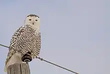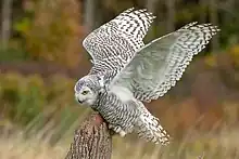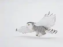 When it goes south to winter outside of the Arctic, the snowy owl has the potential to interact with a number of additional predators.[7] By necessity, it shares its wintertime diverse prey with a number of formidable predators.[7][8] These are known to include their cousins, the great horned owl and the Eurasian eagle-owl. They are relieved of heavy competition from the related species by differing temporal activity, i.e. being more likely to actively hunt in the daytime, and by habitat, using rather more open (quite often nearly treeless) habitats than them.[5][7] During a study of wintering snowy owls in Saskatchewan, the authors indicated that the snowy owls may avoid areas inhabited and defended by great horned owls. Although they usually occurred here outside of an 800 m (2,600 ft) radius of central great horned owl ranges, they did not avoid the 1,600 m (5,200 ft) radius and different habitat usage may be a dictating factor.[208] Given their mildly slighter size, it is unlikely that great horned owls (unlike the larger eagle-owl) would regularly dominate snowy owls in interactions and either species may give way to others depending on the size and disposition of the owls involved.[5][7] Little study has been undertaken into the trophic competition of snowy owls with other predators during winter and, due to their scarcity, few predators are likely to expel much energy on competitive interactions with them, although many other predators will engage in anti-predator mobbing of snowy owls.[7][8] Largely in winter, snowy owls have been the victim of a number of larger avian predators, though attacks are likely to be singular and rare.[7][8] Instances of predation on snowy owls are known to have been committed several times in winter only by Eurasian eagle-owls.[209] Additionally, golden eagles (Aquila chrysaetos) have been known to prey on snowy owls as well as all northern sea eagles: the bald (Haliaeetus leucocephalus), white-tailed (Haliaeetus albicilla) and Steller's sea eagles (Haliaeetus pelagicus).[8][184][210] Snowy owls are also sometimes killed by birds that are mobbing them. In one instance, a peregrine falcon killed a snowy owl in a stoop after the owl had killed a fledgling falcon.[12][204] Anecdotal reports indicate predation by gyrfalcons (on snowy owls of unknown age and condition) but it was possibly also an act of mobbing.[174] In another, a huge throng of Arctic terns (Sterna paradisaea) relentlessly swarmed and attacked a snowy owl until it met its demise.[211]