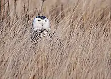 During winter, snowy owls consume more strongly nocturnal prey than lemmings such as Peromyscus mice and northern pocket gophers (Thomomys talpoides).[8][185] In southern Alberta, 248 prey items were found with North American deermouse (Peromyscus maniculatus), at 54.8% by number, and meadow voles (Microtus pennsylvanica), at 27% by number, as the main foods of snowy owls over two years. Other prey in Alberta were grey partridge (Perdix perdix) (at 5.79% of total), jackrabbits, weasels and owls. Richardson's ground squirrels (Urocitellus richardsonii) were consumed heavily in the Alberta study in a brief converged times of hibernation emergence and overwintering snowy owls.[150] The sexual dimorphism in prey selection was also studied here, with male owls mainly focusing exclusively on the small rodents, females also took the same rodents but supplemented the diet with all alternate and larger prey.[150] Overall, the meadow and montane voles (Microtus montanus) constituted 99% of over 4500 prey items in Montana.[156] In Horicon Marsh in winter, 78% of the diet was meadow vole, with 14% being muskrats (Ondatra zibethicus), 6% ducks and smaller balances of rats and other birds.[186] Snowy owls found in Michigan took meadow voles for 86% of the diet, white-footed mouse (Peromyscus leucopus) for 10.3% and northern short-tailed shrew (Blarina brevicauda) for 3.2%.[187] Of 127 stomachs in New England in four irruptive winters from 1927 to 1942, of 155 prey items, 24.5% were brown rats, 11.6% were meadow voles and 10.3% were dovekie (Alle alle), with a smaller balance of snowshoe hare and birds from snow buntings to American black ducks (Anas rubripes). During the same years, stomach contents in Ontario included 40 identified prey items, led by brown rats (20%), white-footed mice (17.5%) and meadow voles (15%); of 81 prey items from Pennsylvania in 60 stomachs that were not empty, eastern cottontail (Sylvilagus floridanus) (32%), meadow vole (11.1%), domestic chicken (Gallus gallus domesticus) (11.1%) and northern bobwhite (Colinus virginianus) (5%) were the most often identified prey species.[139] Introduced common pheasants were found to be somewhat more vulnerable than native American gamebirds like ruffed grouse due to their tendency to crouch rather than flush when approached by a flighted predator like the snowy owl in a glade or field.[139] Some snowy owls wintering on rocky coasts and jetties were known in New England to live almost entirely off of purple sandpipers (Calidris maritima).[139] The availability of brown rats may draw snowy owls to seemingly unattractive settings such as garbage dumps and under bridges. Meanwhile, snowy owls wintering in Lowell, Massachusetts were seen to live largely off of rock doves (Columba livia) caught off of buildings.[139] Of 87 prey from stomachs in Maine, 35% were rats or mice, 20% were snowshoe hares and 10% were passerines.[188] A small study of 20 prey items in an irruptive winter in Kansas found that 35% of the prey were red-winged blackbird (Agelaius phoeniceus), 15% prairie voles (Microtus ochrogaster) and 10% each by American coot (Fulica americana) and hispid cotton rats (Sigmodon hispidus).[189]