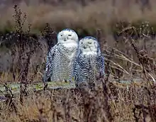 Snowy owls will fight with conspecifics in all seasons occasionally but this is relatively infrequent during breeding and rarer still during winter. Dogfights and talon interlocking may ensue if the fight between two snowy owls continues to escalate.[76][79][78] A study determined that snowy owls are able to orient the whitest parts of their plumage towards the sun, spending about 44% of time oriented as such during sunny days and much less on cloudy days. Some authors interpret this as a presumed signal to conspecifics, but thermoregulation could also be a factor.[118][119] It is known that during winter in Alberta that female snowy owls are territorial towards one another and may not leave an area for up to 80 days but males are nomadic, usually only staying 1–2 days in an area (seldom to 3–17 days). The females spent on average seven times as long in a given area than did males.[120] During threat displays, individuals will lower the front of the body, stretch the head low and forward, with partially extended wings and feathers on the head and raise their back.[79] If continuously threatened or cornered, the posture in the threat display may become still more contoured and, if pressed, the owl will like back and attempt to slash with its large talons. The threat displays of males are generally more emphatic than those of females.[8][121] Although snowy owls have been considered as semi-colonial, they do not appear to fit this mold well. Nesting sites can be loosely clustered but this is a coincidental response to concentrated prey and each pair tends to be somewhat intolerant of each other.[8][122] During winter, snowy owls are usually solitary but some aggregations have been recorded, especially nearer the Arctic when more narrow food selection can lead to up to 20–30 owls gathering in an area of about 20 to 30 ha (49 to 74 acres).[8][123] Congregations were also recorded in the winter in Montana, where 31–35 owls wintered in a 2.6 km2 (1.0 sq mi) area, owls mostly grouped in loose aggregations of 5–10 owls each or occasionally side-by-side or about 20 m (66 ft) apart.[124] In extreme cases in Utqiaġvik, the owls may have exceptionally close active nests that may be down to only 800 to 1,600 m (2,600 to 5,200 ft) apart.[72] Juvenile males appear to be especially prone to loose associations with one another, appearing to be non-territorial and able to hunt freely in front of one another.[8] In a 213 km2 (82 sq mi) area in and around Utqiaġvik, productive years may have about 54 nests while none may be found in poor years.[8] Utqiaġvik may have about 5 owls in early summer every 1.6 km (0.99 mi), have a nest spacing of 1.6 to 3.2 km (0.99 to 1.99 mi) and the owls territory size is about 5.2 to 10.2 km2 (2.0 to 3.9 sq mi).[8] In Churchill, Manitoba, nest spacing averaged about 3.2 km (2.0 mi).[125] In Southampton Island in a year when the owls nested there, nest spacing averaged 3.5 km (2.2 mi), with the closest two 1 km (0.62 mi) apart and density per nest was 22 km2 (8.5 sq mi).[126] In Nunavut, densities could go from 1 owl per 2.6 km2 (1.0 sq mi) in a productive year to 1 owl per 26 km2 (10 sq mi) in a poor year and from 36 nests in a 100 km2 (39 sq mi) area to none at all.[127][128] Owl density on Wrangel Island in Russia was observed be a single bird each 0.11 to 0.72 km2 (0.042 to 0.278 sq mi).[129] The first known study of winter territories took place in Horicon Marsh where owls ranged from 0.5 to 2.6 km2 (0.19 to 1.00 sq mi) each.[66] In Calgary, Alberta, mean territory size of juvenile females in winter was 407.5 ha (1,007 acres) and adult females was 195.2 ha (482 acres).[120] Wintering owls in central Saskatchewan were radio-monitored, determining that 11 males had an average range of 54.4 km2 (21.0 sq mi), while that of 12 females was 31.9 km2 (12.3 sq mi) with the combined average being 53.8 km2 (20.8 sq mi).[130]