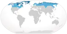 In North America, the breeding range has been known in modern times to include the Aleutians (i.e. Buldir and Attu) and much of northern Alaska, most frequently from the Arctic National Wildlife Refuge to Utqiaġvik, and more sporadically down along the coastal-western parts such as through Nome, Hooper Bay, the Yukon Delta National Wildlife Refuge, and rarely even south to the Shumagin Islands.[2][7] The snowy owl may breed extensively in northern Canada, largely making its home in the Arctic Archipelago.[2] Their Canadian breeding range can include broadly Ellesmere Island up to Cape Sheridan, north coastal Labrador, the northern Hudson Bay, perhaps all of Nunavut (especially the Kivalliq Region), northeastern Manitoba, most of northern mainland and insular Northwest Territories (including the delta of the Mackenzie River) and northern Yukon Territory (where breeding is mostly confined to Herschel Island).[2][6][7][8][89] Since breeding and distribution is very small, local and inconsistent in northern Europe, northern Canada and northern Alaska represent the core part of the breeding range for snowy owls along with several parts of northern and northeastern/coastal Russia.[5][8][42]