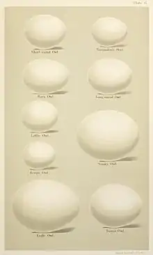 Egg-laying normally begins during early May to the first 10 days of June.[6] Late thaws are harmful to them since they allow too little time for the full breeding process, with particularly importance given to good food supply in May for adults, even more so apparently than food supply in July when young are being fed.[10] Late nests are possible cases of inexperienced pairs, low food supplies, bigamy or even replacement clutches.[8][79][161] The clutch is extremely variable in size averaging around 7–9, with up to 15 or 16 eggs recorded in extreme cases. The clutch size very large relative to related species.[6][7] Mean clutch sizes were 7.5 in a sample of 24 in Hooper Bay (range of 5–11); 6.7 in a sample of seven from Utqiaġvik (4–9); 9 in a sample of a sample of 5 in Baffin Island; 9.8 on Victoria Island; 8.4 (in a sample of 14) on Elsemere Island; 7.4 on Wrangel Island and 7.74 in Finnish Lapland.[72][79][42][80][122] The average clutch size was 9.8 in a good year in Victoria Island while in a good year in Utqiaġvik the mean was 6.5.[64][72] The clutch is laid directly to the ground and are pure, glossy white.[6][8] An average egg is around 56.4 mm × 44.7 mm (2.22 in × 1.76 in) with a range of heights from 50 to 70.2 mm (1.97 to 2.76 in) and diameter of 41 to 49.3 mm (1.61 to 1.94 in). Egg weights are around 47.5 to 68 g (1.68 to 2.40 oz), the median or average being 53 and 60.3 g (1.87 and 2.13 oz) in different datasets.[6][79][112][222][223] The average egg size is relatively small, about 20% smaller than Eurasian eagle-owl eggs and 8% smaller than great horned owl eggs.[5][7][224] Laying intervals are normally 2 days (41–50 hours mostly).[6][225][226] The laying intervals can range up to 3–5 days in inclement weather.[7][227] The laying of a clutch of 11 eggs can take 20–30 days, while a more typical nest of around 8 takes about up to 16 days.[7][12] The interval between the 8th and 9th eggs can be up to about 4 days.[161] Incubation begins with the first egg and is by female alone, while she is fed by her mate.[6]