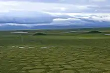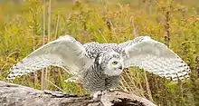 Snowy owls are one of the best known inhabitants of the open Arctic tundra. Frequently, the earth in snowy owl breeding grounds is covered with mosses, lichens and some rocks. Often the species preferentially occurs in areas with some rising elevation such as hummocks, knolls, ridges, bluffs and rocky outcrops.[6][7] Some of these rises in the tundra are created by glacial deposits.[7] The ground is usually rather dry in tundra but in some areas of the southern tundra can also be quite marshy.[7] Not infrequently, they will also use areas of varied coastal habitat, often tidal flats, as a breeding site.[6][7][105] Breeding sites are usually at low elevations, usually less than 300 m (980 ft) above sea level, but when breeding to the south in inland mountains, such as in Norway, they may nest at as high as 1,000 m (3,300 ft).[8][64][42] Outside the breeding season, snowy owls may occupy nearly any open landscape.[6] Typically wintering sites are rather windswept with meager cover.[10] These open areas can include coastal dunes, other coastal spots, lakeshores, islands, moorlands, steppes, meadows, prairies, other extensive grasslands and rather shrubby areas of the Subarctic. These may be favored due to their vague similarity to the flat openness of the tundra.[7][10] Manmade open sites are now perhaps even more used than natural ones, often agricultural fields and rangeland, as well as large areas of cleared forests.[8][106][107] During irruption years when they are found in the northeastern United States, juveniles frequent developed areas including urban areas and golf courses, as well as the expected grasslands and agricultural areas that older birds primarily use.[96] On the plains of Alberta, observed snowy owls spent 30% of their time in stubble-fields, 30% in summer fallow, 14% in hayfield and the remainder of the time in pasture, natural grasslands and sloughs. The agricultural areas, large untouched by the farmers in winter, may have had more concentrated prey than the others in Alberta.[108] Perhaps the most consistently attractive habitat in North America to wintering snowy owls in modern times may be airports, which not only tend to have the flat, grassy characteristics of their preferred habitats but also by winter host a particular diversity of prey, both pests which rely on humans as well as wildlife attracted to the extensively grassy and marshy strips that dot the large airport vicinities. For example, Logan International Airport in Massachusetts has relatively one of the most reliable annual populations known in the United States in winter.[7][8][109] All ages spend a fair amount of their time over water in the Bering Sea, the Atlantic Ocean and even the Great Lakes, mostly on ice floes.[57] These marine and ocean-like freshwater areas were observed to account for 22–31% of habitat used in 34 radio-tagged American snowy owls over two irruptive years, with the tagged owls occurring a mean of 3 km (1.9 mi) from the nearest land (while 35–58% used the expected preferred habitats of grassland, pasture and other agricultural land).[107]