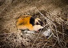 On the isle of St. Kilda, 24 pellets were found for non-breeding snowy owls that stayed through the early summer. Of 46 prey items, the St Kilda field mouse (Apodemus sylvaticus hirtensis) was predominant by number at 69.6% but constituted 16.8% of biomass while adult Atlantic puffin (Fratercula arctica) constituted 63.5% of the prey biomass and 26% by number (rest of the balance being juvenile puffins and great skuas (Stercorarius skua)).[190] The main subspecies of wood mouse was similarly dominant in the diet within County Mayo, Ireland and were presumably snatched at night due to their strict nocturnality.[191] In Knockando, the winter diet was led by European rabbits (40.1%), red grouse (Lagopus lagopus scotica) (26.4%) and adult mountain hare (Lepus timidus) (20.9%) (in 156 pellets); in Ben Macdui, the diet was led by rock ptarmigan (72.3%), field voles (Microtus agrestis) and juvenile mountain hare (8.5%) (33 pellets); in Cabrach, the diet was led by red grouse (40%), mountain hare (20%) and European rabbit (15%) (16 pellets).[192] Among 110 prey items found for snowy owls found wintering during irruption in southern Finland, all but 1 prey item were field voles (the only other prey being a single long-tailed duck (Clangula hyemalis)).[167] Far to the east, wintering owls in the Irkutsky District were found to subsist mostly on narrow-headed voles (Microtus gregalis).[193] In a wintering population in Kurgaldga Nature Reserve of Kazakhstan, the main foods were grey red-backed voles at 47.4%, winter white dwarf hamster (Phodopus sungorus) at 18.4%, steppe pika (Ochotona pusilla) at 7.9%, muskrat at 7.9%, Eurasian skylark (Alauda arvensis) at 7.9%, grey partridge at 5.3%, and both steppe polecat (Mustela eversmanii) and yellowhammer (Emberiza citrinella) at 2.6%. On the Kuril Islands, wintering snowy owls' main foods were reported as tundra voles, brown rats, ermines, and whimbrel, in roughly that order.[5]