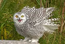The snowy owl differ in their calls from other Bubo owls, with a much more barking quality to their version of a hooting song.[10] Perhaps as many as 15 different calls by mature snowy owls have been documented.[76][77] The main vocalization is a monotonous sequence that normally contains 2–6 (but occasionally more), rough notes similar to the rhythm of a barking dog: krooh krooh krooh krooh...[6] The call may end with an emphatic aaoow, which is somewhat reminiscent of the deep alarm call of a great black-backed gull (Larus marinus).[7] They will call mainly from a perch but also sometimes do so in flight.[6] The krooh call of the male snowy owl may perform multiple functions such as competitive exclusion of other males and advertising to females.[8][78] The calls of this species may carry exceptionally far in the thin air of Arctic, certainly over more than 3 km (1.9 mi), and maybe even to as much 10 to 11 km (6.2 to 6.8 mi) away.[7][12] The female has a similar call to male but can be higher-pitched and/or more guttural as well as single notes which are often disyllabic, khuso.[6] Female snowy owls have also been known to utter chirps and high screaming notes, similar to those of the nestlings.[6] Both sexes may at times give a series of clucking, squeals, grunts, hisses and cackles, perhaps such as in circumstances when they are excited.[6][7][8][79] The alarm call is a loud, grating, hoarse keeea.[7] Another raspier bark is recorded, sometimes called a "watchman's rattle" call, and may be transcribed as rick, rick, rick, ha, how, quack, quock or kre, kre, kre, kre, kre.[80] A female attacking to protect her nest was recorded to let out a crowed ca-ca-oh call, whilst other owls attacking to protect the nest did a loud version of the typical call while circling before dropping down.[78][80] They may also clap their beak in response to threats or annoyances. While called clapping, it is believed this sound may actually be a clicking of the tongue, not the beak. Though largely only vocal in the breeding season, leading to some erroneous older accounts describing the snowy owl as completely silent, some vocalizations have been recorded in winter in the northern United States.[76] Initially, the young of the snowy owl have a high pitched and soft begging call which develops into a strong, wheezy scream at around 2 weeks. At the point when the young owls leave the nest around 3 weeks, the shrill squeals they emit may allow the mothers to locate them.[64][79]