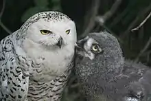 Snowy owls are not known to interbreed with other owl species in the wild, and accordingly, no hybrids of snowy owls and other owl species have yet been sighted in the wild. However, a hobby falconer in Kollnburg, Germany, bred hybrids from a male snowy owl and a female Eurasian eagle-owl (Bubo bubo) in 2013.[34] The two resulting male hybrid owls possessed the prominent ear-tufts (generally absent in snowy owls), general size, orange eyes, and the same pattern of black markings on their plumage from their Eurasian eagle-owl mother, while retaining the generally black-and-white plumage colours from their snowy owl father. The hybrids were dubbed "Schnuhus" from the German words for snowy owl and Eurasian eagle-owl (Schnee-Eule and Uhu, respectively). As of 2014, the hybrids had grown to maturity and were healthy.[34]