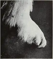 The toes of the snowy owl are extremely thickly feathered white, while the claws are black.[6] The toe feathers are the longest known of any owl, averaging at 33.3 mm (1.31 in), against the great horned owl which has the 2nd longest toe feathers at a mean of 13 mm (0.51 in)[7][43] Occasionally, snowy owls may show a faint blackish edge to the eyes and have a dark gray cere, though this is often not visible from the feather coverage, and a black bill.[6] Unlike many other whitish birds, the snowy owl does not possess black wingtips, which is theorized to minimize wear-and-tear on the wing feathers in the other whitish bird types.[44] The conspicuously notched primaries of the snowy owl appear to give an advantage over similar owls in long-distance flight and more extensive flapping flight.[45] The snowy owl does have some of the noise-canceling serrations and comb-like wing feathers that render the flight of most owls functionally silent, but they have fewer than most related Bubo owls. Therefore, in combination with its less soft feathers, the flight of a snowy owl can be somewhat audible at close range.[5][46] The flight of snowy owls tends to be steady and direct and is reminiscent to some of the flight of a large, slow-flying falcon.[5] Though capable of occasional gliding flight, there is no evidence that snowy owls will soar. It is said that the species seldom exceeds a flying height of around 150 m (490 ft) even during passage.[5] While the feet are sometimes described as "enormous", the tarsus is in osteological terms relatively short at 68% the length of those of a Eurasian eagle-owl but the claws are nearly as large, at 89% of the size of those of the eagle-owl.[7][10][19] Despite its relatively short length, the tarsus is of similar circumference as in other Bubo owls.[47] Also compared to an eagle-owl, the snowy owl has a relatively short decurved rostrum, a proportionately greater length to the interorbital roof and a much longer sclerotic ring surrounding the eyes while the anterior opening are the greatest known in any owl.[7][19][48] Owls have extremely large eyes which are nearly the same size in large species such as the snowy owl as those of humans.[49] The snowy owl's eye, at about 23.4 mm (0.92 in) in diameter, is slightly smaller than those of great horned and Eurasian eagle-owls but is slightly larger than those of some other large owls.[7][50] Snowy owls must be able to see from great distances and in highly variable conditions but probably possess less acute night vision than many other owls.[5] Based on the study of dioptres in different owl species, the snowy owl was determined to have eyesight better suited to long-range perception than to close discrimination, while some related species such as great horned owls could probably more successful perceive closer objects.[51] Despite their visual limits, snowy owls may have up to 1.5 times more visual acuity than humans.[5] Like other owls, snowy owls can probably perceive all colors but cannot perceive ultraviolet visual pigments.[52][53][54][55] Owls have the largest brains of any bird (increasing in sync with the size of the owl species), with the size of the brain and eye related less to intelligence than perhaps to increased nocturnality and predatory behavior.[56]