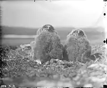Most individuals arrive at the nest site by April or May with a few overwintering arctic exceptions.[105][92][123] Males advertises potential nest sites to his mate by scratching the ground and spreading his wings over it.[6] The nest is usually a shallow depression on a windswept eminence in the open tundra. There seems to be a variety of qualifiers for appropriate nest sites. The nest site is typically snow-free and dry relative to the surrounding environment, usually with a good view of the surrounding landscape. The nest may be made of ridges, elevated mounds, high polygons, hummocks, hills, human-made mounds and occasionally rocky outcrops. If covered with vegetation, taller plants that may obstruct view are plucked away sometimes.[6][7][79][123][217] The nest sites are often long-established and naturally created by the freeze-thaw process of the tundra.[7][8] Gravel bars may be used as well.[5] The female may take the most active role in the nest's condition of any owl species.[8][26] No owl build their own nests but female snowy owls take about three days constructing a scrape, digging with her claws and rotating until a fairly circular bowl is formed. She will still not construct or add foreign materials to the nest (despite some circumstantial evidence of moss and grass from outside the nest mound being found).[8][105][113] In two separate cases in Utqiaġvik, two separate females dug out a second scrape to the side and below the main nests and appeared to have called all chicks to the more secluded nest to ride out severe weather until the skies cleared.[8] The Utqiaġvik nest scrapes averaged 47.7 cm × 44 cm (18.8 in × 17.3 in) in 91 with a mean depth of 9.8 cm (3.9 in) while the scrapes were smaller in Hooper Bay, reportedly 25 to 33 cm (9.8 to 13.0 in) diameter and 4 to 9 cm (1.6 to 3.5 in) in depth.[105][217] Occasionally, in the lower tundra, snowy owls may too use old nests of rough-legged buzzards as well as abandoned eagle nests.[7] Unlike other northerly breeding raptorial birds, the snowy owl is not known to nest on cliffs and the like, so do not enter into direct competition with eagles, falcons, ravens or other Bubo owls when nesting to the relative south.[7] The area of nest mound often has a relatively rich plant life which attract the lemmings, which may tunnel right under and around the owl's nest.[7] Geese, ducks and shorebirds of several species known to gain incidental protection by nesting close to snowy owls. Conversely, the snowy owls will sometimes kill and eat both young and adults of these birds, which implies a trade-off in the benefits.[64][105][161][218][219][220][221]
