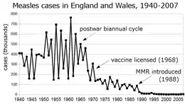 Before the introduction of vaccination in the US in the 1960s there were more than 500,000 cases each year resulting in about 400 deaths. In developed countries children were mainly infected between the ages of three and five years old, but in developing countries half the children were infected before the age of two.[143] In the US and the UK, there were regular annual or biannual epidemics of the disease, which depended on the number of children born each year.[144] The current epidemic strain evolved in the first part of the 20th century – probably between 1908 and 1943.[145]