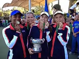 Kenin reached a career-high of No. 2 in the ITF junior rankings.[9] She began playing in low-level Grade-4 events on the ITF Junior Circuit in 2012 at the age of 13. After winning her first titles in both singles and doubles in 2013, she progressed to the Grade 1 level.[9] Towards the end of the year, she made her Grade-A debut at the Orange Bowl, reaching the semifinals in singles and finishing runner-up in doubles with Kaitlyn McCarthy to Tornado Alicia Black and Naiktha Bains.[10] Kenin made her junior Grand Slam debut in 2014, but only recorded one match win in singles while playing in the latter three events of the year.[9] Following the US Open, Kenin represented the United States at the Junior Fed Cup along with CiCi Bellis and Black. The team won the tournament, sweeping Slovakia 3–0 in the final. Kenin went undefeated in her five matches, all in doubles.[11] Her next breakthrough came toward the end of the year when she won the Orange Bowl, defeating Bellis and Ingrid Neel in the last two rounds.[12]