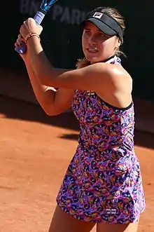 Kenin greatly improved in 2019, rising from outside the top 50 at the start of the year to just outside the top ten by the end of the season.[21] She began her year by winning her first WTA doubles title at the Auckland Open with Eugenie Bouchard.[36] The following week, she won her first WTA singles title at the Hobart International without dropping a set during the event. She upset the top seed and No. 19 Caroline Garcia in the first round, before defeating Anna Karolína Schmiedlová in the final.[37] With this success, Kenin rose to what was at the time a career-best ranking of No. 37.[38] At the Australian Open, she pushed world No. 1 Simona Halep to three sets in the second round, ultimately losing in a long two-hour-and-thirty-minute match.[39] The following month, Kenin reached another WTA final at the Mexican Open, finishing runner-up to Wang Yafan despite being up a set and a break.[40] During the clay-court season, Kenin improved on her results from the previous year. She reached the third round at the Italian Open, defeating compatriot Madison Keys before losing to Plíšková. Her best result on clay came at the French Open, where she reached the fourth round. During the event, she upset world No. 10, Serena Williams, in the third round before losing to eventual champion Ashleigh Barty.[41][42]