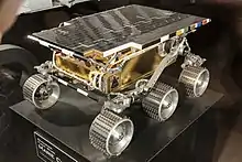 In the ten-year development phase that led to the realization of Sojourner, alternative solutions that could take advantage of the long experience gained at JPL in the development of vehicles for the Moon and Mars were examined.[27] The use of four or more legs was excluded for three reasons: a low number of legs would limit the rover's movements and the freedom of action, and increasing the number would lead to a significant increase in complexity. Proceeding in this configuration would also require knowledge of the space in front—the ground corresponding to the next step—leading to further difficulties.[26] The choice of a wheeled vehicle solved most of the stability problems, led to a reduction in weight, and improved efficiency and control compared to the previous solution.[26] The simplest configuration was a four-wheel system that, however, encounters difficulties in overcoming obstacles. Better solutions were the use of six or eight wheels with the rear ones able to push, allowing the obstacle to be overcome. The lighter, simpler, six-wheeled option was preferred.[26]