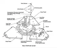 One of the lander's main tasks was to support the rover by imaging its operations and sending data from the rover to Earth. The lander had rechargeable batteries and over 2.5 m (8.2 ft) of solar cells on its petals.[15] The lander contained a stereoscopic camera with spatial filters on an expandable pole called Imager for Mars Pathfinder (IMP),[16][17] and the Atmospheric Structure Instrument/Meteorology Package (ASI/MET)[18] which acted as a Mars meteorological station, collecting data about pressure, temperature, and winds. The MET structure included three windsocks mounted at three heights on a pole, the topmost at about one meter (3.3 ft) and generally registered winds from the west.[19] To provide continuous data, the IMP imaged the windsocks once every daylight hour. These measurements allowed the eolian processes at the landing site, including the particle threshold and the aerodynamic surface roughness, to be measured.[13]