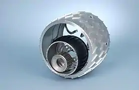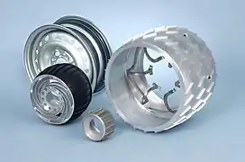The rover's wheels were made of aluminum and were 13 cm (5.1 in) in diameter and 7.9 cm (3.1 in) wide. They had serrated, stainless steel tracks that could generate a pressure of 1.65 kPa (0.239 psi) in optimal conditions on soft ground.[25] No such need arose during the operational phase.[25] Each wheel was driven by its own independent motor.[7] The first and third wheels were used for steering. A six-wheel-steering configuration was considered, but this was too heavy.[25] As the rover rotated on itself, it drew a 74 cm (29 in) wide circle.[7]