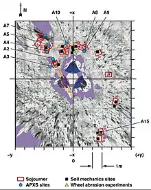 The Wheel Abrasion Experiment (WAE) was designed to measure the abrasive action of Martian soil on thin layers of aluminum, nickel, and platinum, and thus deduce the grain size of the soil at the landing site. For this purpose, 15 layers—five of each metal—were mounted on one of the two central wheels with a thickness between 200 and 1000 ångström, and electrically isolated from the rest of the rover. By directing the wheel appropriately, sunlight was reflected towards a nearby photovoltaic sensor. The collected signal was analyzed to determine the desired information.[52] For the abrasive action to be significant on the mission schedule, the rover was scheduled to stop at frequent intervals and, with the other five wheels braked, force the WAE wheel to rotate, causing increased wear.[53] Following the WAE experiment on Mars, attempts were made to reproduce the effects observed in the laboratory.[53]