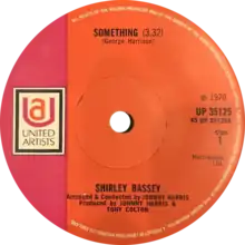 Among the song's many cover versions, Welsh singer Shirley Bassey recorded a successful version of "Something".[139] It was released in 1970 as the title track to her album of the same name.[140] Also issued as a single, it became Bassey's first top-ten hit in the UK since "I (Who Have Nothing)" in 1963, peaking at number 4 and spending 22 weeks on the chart.[141] The single also reached the top twenty in other European countries[142] and peaked at number 6 on Billboard's Easy Listening (later Adult Contemporary) chart.[143]