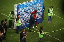 Son opened his 2019–20 account on 14 September 2019 by scoring two goals against Crystal Palace in the Premier League with a final result of 4–0.[93] On 21 October, Son was named in the 30-man shortlist for the 2019 Ballon d'Or.[94] On 3 November, Son was sent off during a 1–1 draw with Everton after sliding into André Gomes from behind, causing him to fall awkwardly and suffer a severe ankle injury. The injury prompted great concern and anguish from the players and supporters; Son was visibly highly distressed by the incident.[95] Following a red card for a challenge on Gomes, Son also received suspension for three Premier League games.[96] However, many professionals including former Everton player Kevin Kilbane expressed criticism of the red card decision, and Tottenham made an appeal to the Football Association against the dismissal. The FA accepted the appeal and Son's red card was rescinded on 5 November.[97][98] Three days after this incident, in a 4–0 Champions League away game to Red Star Belgrade, in which Son scored a brace, rather than celebrating his first goal, he apologised to the camera for what happened at Goodison Park.[99][100]