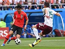 On 13 June 2017, Son broke his right forearm after falling awkwardly on his arm during a World Cup qualifier match in Doha against Qatar.[160] He was part of the team that saw Korea qualify for the 2018 World Cup after a 0–0 draw against Uzbekistan on 5 September 2017.[161] On 4 June 2018, Son was selected in 23-man squad for the World Cup.[162] On 23 June, Son scored a goal from outside the penalty area – a curling strike into the top corner – though his side was defeated with a 2–1 loss to Mexico in their second group stage match of the World Cup.[163] On 27 June, during their final group stage match, he scored the second goal in the 97th minute in their 2–0 victory over world champions Germany, sealing their elimination.[164]