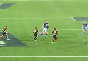 On 25 February, Williams made his 2012 Super Rugby debut for the Chiefs against the Highlanders, In early March he was named as the NZRU's Teen Rugby Ambassador.[120] On 14 April, Williams scored his first try for the Chiefs while playing against the Cheetahs.[121] On 13 May he scored his second try in the Chiefs' first loss since their club record of nine consecutive wins.[122][123] On 2 June he scored his third try while playing against the Blues.[124] During the mid-year rugby test series, Williams played in all three of New Zealand's matches against Ireland, scoring two tries in the last game of the series. On 6 July he scored his fourth try for the Chiefs—this time against his former club, the Crusaders.[125] On 4 August, Williams played in the Chiefs' 37–6 victory against the Sharks in the Super Rugby final, scoring the last try of the match then celebrating by leaping into the home crowd.[126] With this victory, Williams became only the fourth person, after Peter Ryan, Brad Thorn and Will Chambers, to have won both an NRL and Super Rugby title.[127] He also ended the season with the most off-loads (for a second consecutive year),[128] most tackle busts, most line-breaks[129] and most turnovers gained.[130] He was also awarded the Chiefs' players' player award.[131]