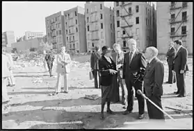 Primarily beginning in the 1980s, parts of the South Bronx started to experience urban renewal with rehabilitated and new residential structures, including subsidized multifamily townhomes and apartment buildings.[35] Between 1986 and 1994, over $1 billion were spent on rebuilding the area, with 19,000 apartments refurbished and more than 4,500 new houses built for the working class. More than fifty abandoned apartment buildings on the Major Deegan Expressway and the Cross Bronx Expressway were renovated for residential use. Over 26,500 people moved into the area.[20] On Charlotte Street, prefabricated ranch-style houses were built in the area in 1985,[36] and the area changed so significantly that a Bronx borough historian (Lloyd Ultan) could not locate where Carter had stopped to survey the scene. As of 2004, houses on the street were worth up to a million dollars.[33]