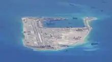 In 2013, the PRC began island building in the Spratly Islands and the Paracel Islands region.[8] According to Reuters, island building in the South China Sea primarily by Vietnam and the Philippines has been going on for decades on a small scale; while China has come late to the island building game, its efforts have been on an unprecedented scale as it had from 2014 to 2016 constructed more new island surface than all other nations have constructed throughout history and as of 2016 placed military equipment on one of its artificial islands unlike the other claimants.[9] A 2019 article in Voice of America which compared China and Vietnam's island building campaign in the South China Sea similarly reported the reason why Vietnam in contradistinction to China has been subject to little international criticism and even support was because of the slower speed and widely perceived defensive nature of its island-building project.[10]