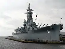 South Dakota was built as a fleet flagship, with an extra deck on her conning tower for extra command space, so her secondary battery had sixteen 5-inch (127 mm)/38 caliber Mark 12 guns in eight Mark 28 Mod 0 twin dual-purpose (DP) mounts, four on either side of the superstructure. This was two turrets fewer than her sister ships who had ten twin DP mounts of twenty guns, five on either side of the ship.[18] These turrets weighed 156,295 lb (70,894 kg) and could depress their guns to −15 degrees and elevate them to 85 degrees. The guns fired a variety of different projectiles, including anti-aircraft (AA), illumination, and white phosphorus (WP) shells, at a rate of fire of 15–22 rounds per minute. The AA shells were 20.75 in long (52.7 cm) and weighed between 54 and 55 lb (24–25 kg), depending on the variant. The illumination and white phosphorus shells were slightly smaller, at 20 in (51 cm) long; the illumination rounds weighed 54.4 lb (24.7 kg) and the WP shells were 53 lb (24 kg).[19]