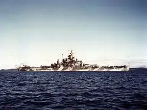 Following her successful operations off North Africa, Massachusetts was taken in for an overhaul in the Boston Navy Yard. After the refitting, the ship sailed for the Pacific theater, and arrived in Nouméa on 4 March.[43] The battleship supported operations in the South Pacific over the next months, including guarding convoy lanes, escorting aircraft carriers, and bombarding Japanese positions on various islands, including Nauru (8 December 1943) and Kwajalein (30 January 1944). Returning to carrier protection after the latter bombardment, Massachusetts provided anti-aircraft defense while Allied air attacks were sent against Saipan, Tinian and Guam; she also supported later invasions of the Caroline Islands and Hollandia. After bombarding Ponape Island on 1 May, the ship set course for the Puget Sound Navy Yard for an overhaul and to have her gun barrels relined, as they had worn out.[41]