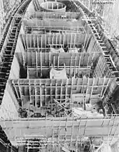 Arguments arose, frequently over the issue of speed; the Commander in Chief, United States Fleet (CINCUS) refused to allow the new ship to drop below 25 knots (46 km/h; 29 mph), the Battle Force argued at least 27 knots (50 km/h; 31 mph) was necessary to maintain homogeneity in the line of battle, and the president of the War College maintained a fast ship was optimal, but the navy would continue to operate the older 21 knots (39 km/h; 24 mph) battleships until the 1950s and so a higher speed was not strictly necessary—though, crucially, it would mean the class would have been too slow to act in what would emerge as the most critical role for battleships, as escorts for fast carrier task forces. The primary 666-ft design was the only plan that could meet the specified requirements for speed, protection, and the nine 16-inch guns.[8] By late 1937 a proposed design was agreed on, requiring only small modifications to save weight and increase the fields of fire.[9] Berths for the crew, even the staterooms for senior officers, along with mess halls were reduced in size, and ventilation ports were completely removed, forcing the ship to rely completely on artificial air circulation.[10]