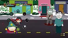South Park: The Stick of Truth is a role-playing video game[1] that is viewed from a 2.5D, third-person perspective.[2] The player controls the New Kid as he explores the fictional Colorado town of South Park.[3] The player can freely move around the town although some areas remain inaccessible until specific points in the story are reached. Notable characters from the series – including Cartman, Butters, Stan, and Kyle – join the New Kid's party and accompany him on his quests,[3] though only one character can be active at any time.[4] The game features a fast travel system, allowing the player to call on the character Timmy to quickly transport them to any other visited fast travel station.[5][6] At the beginning of the game, the player selects one of four character archetypes; the Fighter, Thief, Mage (which represent standard fantasy types), and the Jew. The Jew class specializes in "Jew-jitsu" and long-range attacks. Each class has specific abilities; armor and weapons are not limited by class, allowing a Mage to focus on melee attacks like a Fighter.[3][4]