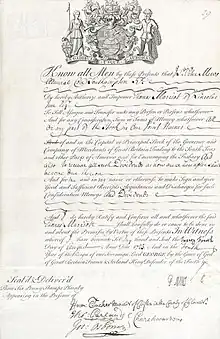 ![]() Arms of the South Sea Company: Azure, a globe whereon are represented the Straits of Magellan and Cape Horn all proper and in sinister chief point two herrings haurient in saltire argent crowned or, in a canton the united arms of Great Britain | |