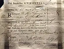 The South Sea Company (officially: The Governor and Company of the merchants of Great Britain, trading to the South Seas and other parts of America, and for the encouragement of the Fishery)[3] was a British joint-stock company founded in January 1711, created as a public-private partnership to consolidate and reduce the cost of the national debt. To generate income, in 1713 the company was granted a monopoly (the Asiento de Negros) to supply African slaves to the islands in the "South Seas" and South America.[4] When the company was created, Britain was involved in the War of the Spanish Succession and Spain and Portugal controlled most of South America. There was thus no realistic prospect that trade would take place, and as it turned out, the Company never realised any significant profit from its monopoly. However, Company stock rose greatly in value as it expanded its operations dealing in government debt, and peaked in 1720 before suddenly collapsing to little above its original flotation price. The notorious economic bubble thus created, which ruined thousands of investors, became known as the South Sea Bubble.