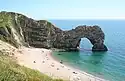The east of the region is characterised by wide, flat clay vales, and chalk and limestone downland. The vales, with good irrigation, are home to the region's dairy agriculture. The Blackmore Vale was Thomas Hardy's "Vale of the Little Dairies";[11] another, the Somerset Levels was created by reclaiming wetlands.[12] The Southern England Chalk Formation extends into the region, creating a series of high, sparsely populated and archaeologically rich downs, most famously Salisbury Plain, but also Cranborne Chase, the Dorset Downs and the Purbeck Hills. These downs are the principal area of arable agriculture in the region. Limestone is also found in the region, at the Cotswolds, Quantock Hills and Mendip Hills, where they support sheep farming.[13] All of the principal rock types can be seen on the Jurassic Coast of Dorset and East Devon, where they document the entire Mesozoic era from west to east.[14]